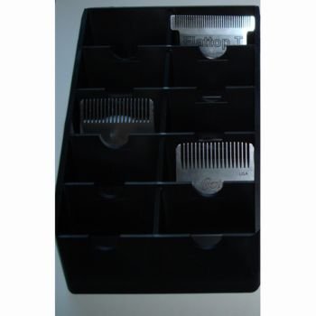 Clipper Blade Rack Organizer This Clipper Blade Rack Organizer conveniently stores, organizes and protects up to 10 valuable clipper blades of various sizes. The rack can be easily mounted on a wall, placed on a counter top or in a drawer. It is a must for every work station! Item Specifications: Dimensions: · 7-1/2"H x 5"W Material: · High-impact styrene Color: · Black